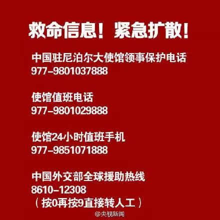 如果你有亲戚朋友在尼泊尔,请一定要告诉TA:中国驻尼泊尔大使馆领事部地址: Hattisar, Kathmandu;使馆电话(白天): 00977-1-4411740;领事保护: 00977-9801037888 (24小时);值班手机: 00977-9801029888 (24小时);中国外交部全球援助热线:+86-10-12308。遇困难时,有用!
