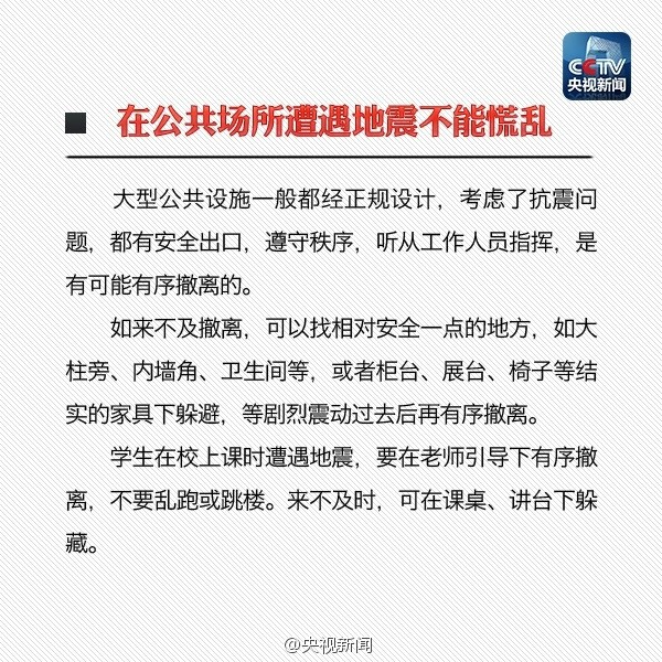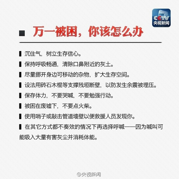 【万一地震,如何自救逃生?】“宁可千日不震,不可一日不防”。地震离你我并不遥远,灾难一旦发生,生死存亡就在瞬息之间。认真记下以下这几张图上的内容,未雨绸缪,学习掌握应急避震知识,万一遭遇强震,就能减少自己和家人的生命危险。